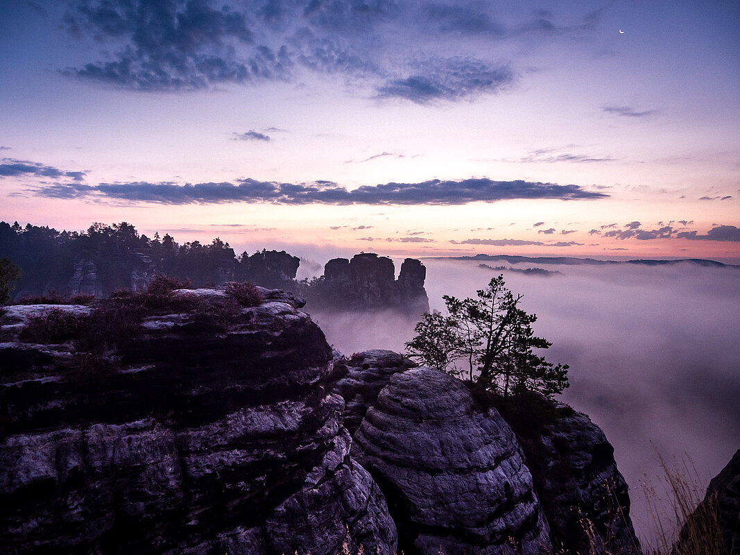 Und was soll ich euch sagen, der Sonnenaufgang war magisch. Wir hatten erst Hochnebel, der aber nach und nach recht schnell den Blick auf das Elbsandsteingebirge frei gab. Und dieser Nebel hat genau das Tüpfelchen auf dem "i" ausgemacht. WOW...